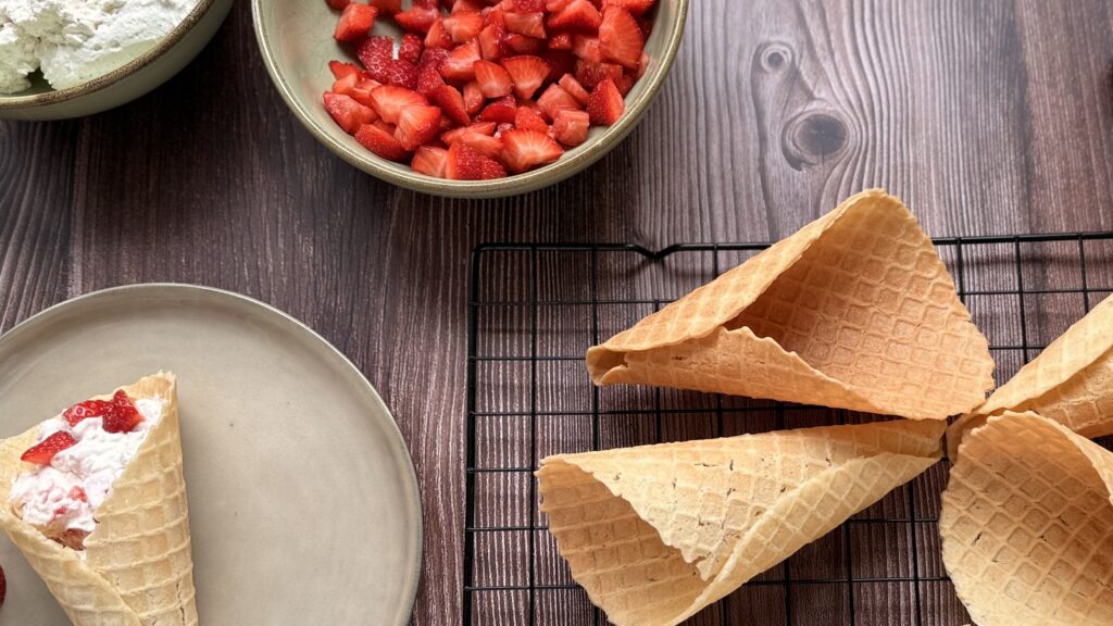 - Die Creme vorsichtig in die abgekühlten Hörnchen füllen und kurz kalt stellen.