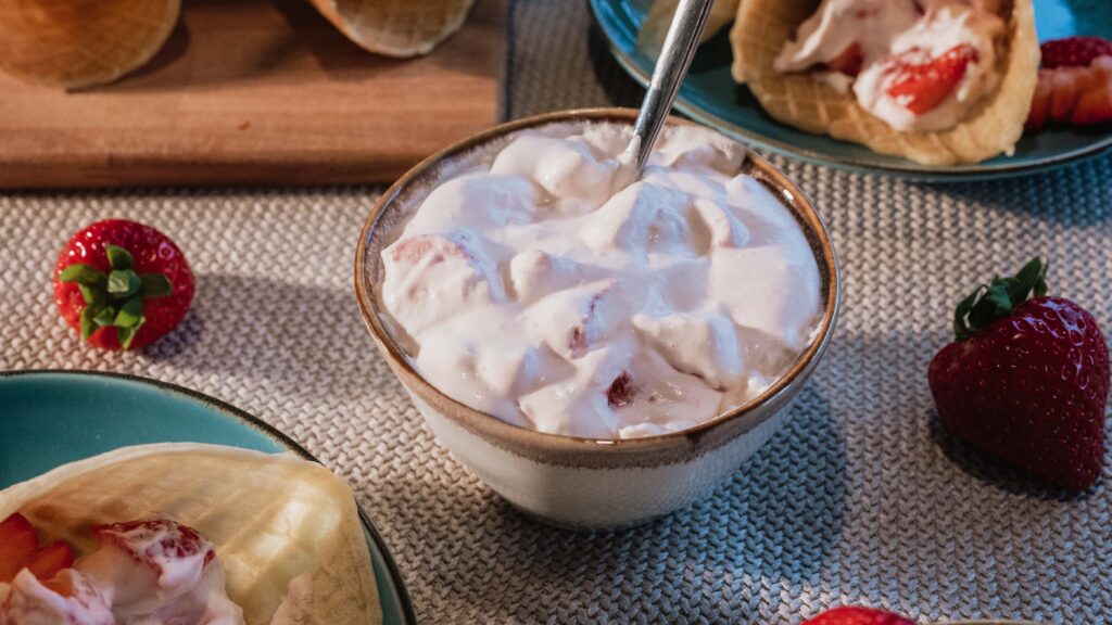 - Nach Wunsch klein gewürfelte Erdbeeren einrühren oder mit einem Spritzbeutel beim Füllen der Hörnchen dazugeben.