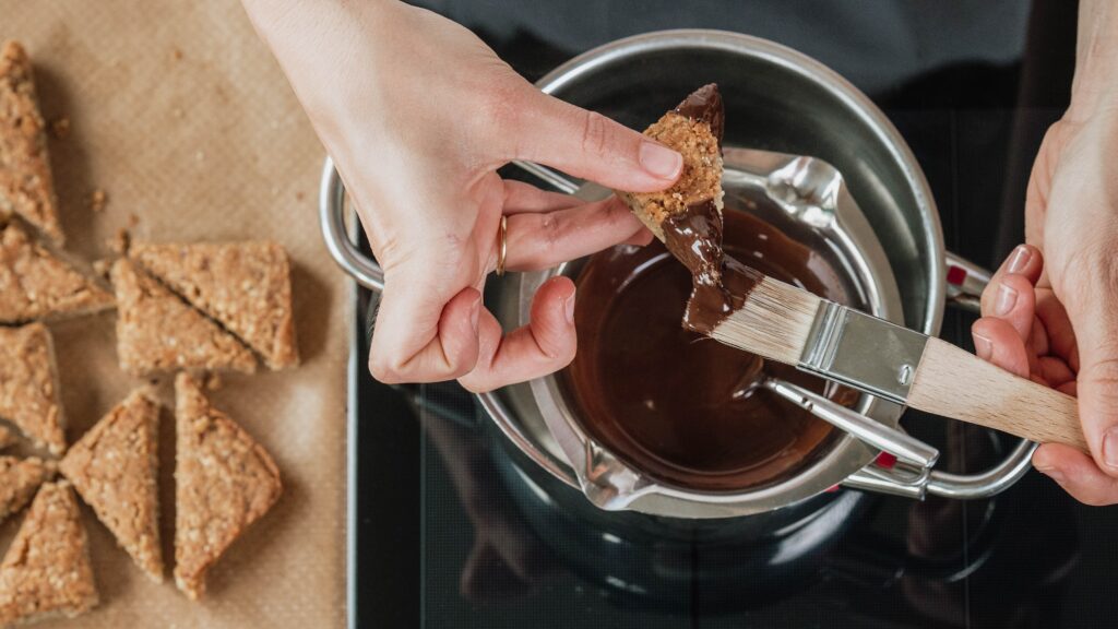 - Für die Glasur: 120 g Zartbitterschokolade im Wasserbad schmelzen. Die Spitzen der Nussecken in Schokolade tauchen oder nach Wunsch bestreichen. Fest werden lassen – fertig!